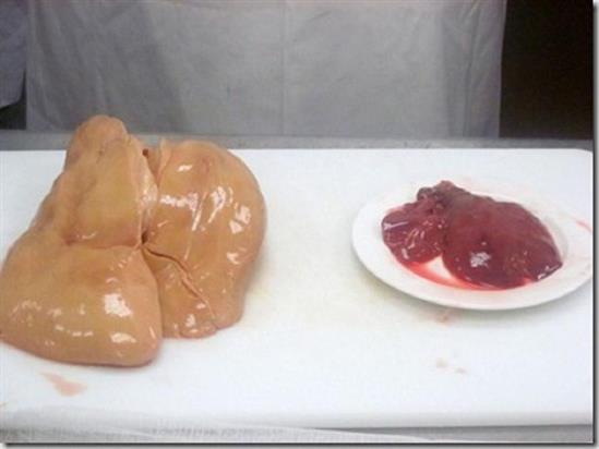 Gan ngỗng vỗ béo (trái) và gan ngỗng thường (phải)