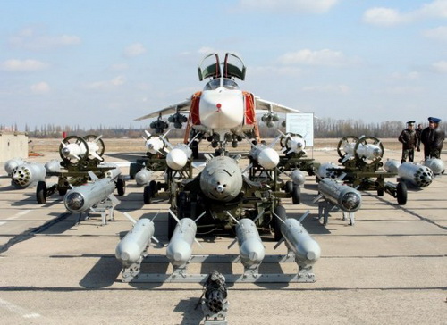Su-24 8 giá treo vũ khí dưới cánh với tổng tải trọng lên đến 8 tấn. Máy bay có thể mang 4 tên lửa không đối đất Kh-23 hoặc 4 Kh-25, 2 tên lửa tấn chống bức xạ Kh-58, Kh-31P và các loại bom có hoặc không điều khiển khác. Ảnh: Aerospaceweb