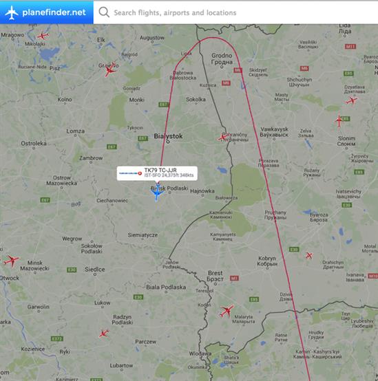 Đường bay của máy bay Boeing 777-300 của hãng hàng không Turkish Airlines.