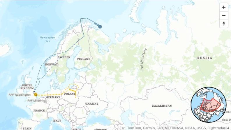 Dữ liệu từ Flightradar24, được tờ Newsweek lập bản đồ, cho thấy chiếc RC-135W của RAF cất cánh từ căn cứ Waddington, Lincolnshire, Anh lúc 8h11 sáng 15/7. Máy bay bay qua Na Uy, Thụy Điển và Phần Lan trước khi rẽ về phía đông nam hướng tới Nga.