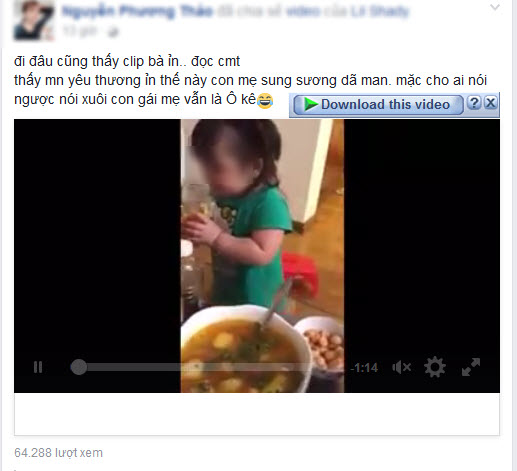 Không biết Facebook cá nhân tăng được bao nhiêu lượt theo dõi (hiện gần 9.000) nhờ đăng hai clip con gái say xỉn và cười nắc nẻ khi uống bia, chị Nguyễn Phương T. đang hại con mình nhưng vẫn bày tỏ sự sung sướng khi clip lan tỏa nhanh: “Đi đâu cũng thấy clip bà ỉn… Đọc bình luận thấy thấy mọi người yêu thương ỉn thế này sung sướng dã man. Mặc cho ai nói ngược nói xuôi, con gái mẹ vẫn là ô kê”.