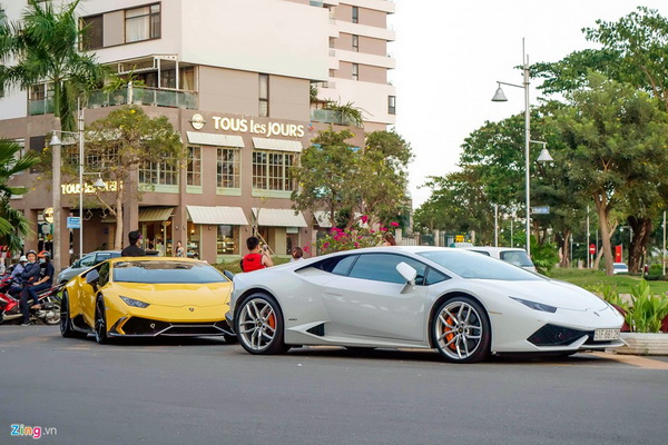 Các đại gia Sài Gòn cũng góp vui bằng dàn Lamborghini đủ chủng loại, trong đó có Huracan màu trắng. Trước khi tăng thuế, Huracan có giá khoảng 13 tỷ đồng tại Việt Nam. Hiện nay, những chiếc xe mới được rao giá khoảng 20 tỷ đồng.