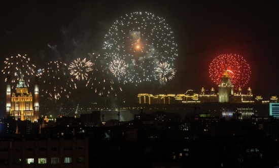 Người dân Moscow có thể thưởng thức những màn pháo hoa rực rỡ ở tòa nhà Đại học Quốc gia Moscow Lomonosov