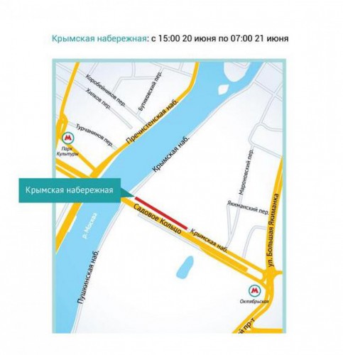 Đường kè bờ sông Krưmskaya sẽ bị han chế giao thông trong thời gian diễn ra Lễ hội tốt nghiệp của học sinh phổ thông vào ngày 20, 21 tháng 6. Việc hạn chế giao thông trong khu vực này sẽ bắt đầu từ 15 giờ ngày 20/6 và kéo dài đến 7 giờ sáng 21/6 nhằm phục vụ cho việc tổ chức lễ hội trong công viên văn hoá Gorky, kênh Moskva 24 dẫn nguồn tin từ trang blog của Sở Giao thông vận tải Moskva.