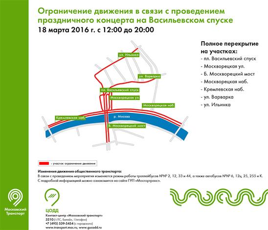 Cơ quan quản lý giao thông Moskva dự  báo về sự xuất hiện của những đám ùn tắc giao thông ở khu vực trung tâm thành phố vào chiều thứ sáu 18/3, do một số tuyến đường trung tâm bị chặn để bảo đảm an ninh trật tự cho buổi hòa nhạc trên Quảng trường Đỏ.