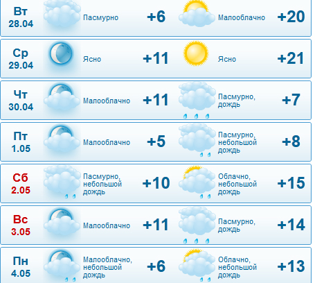 Vào ngày đầu tiên trong tuần này, Moskva bắt đầu được bao phủ bở luồng không khí ấm, nhiều nơi sẽ có mưa rào, vào ban đêm, nhiệt độ  ở thủ đô từ 5...10 độ C, nhiệt độ ban ngày sẽ đạt từ 13...18 độ C. Ngày mai, thứ ba, mây sẽ tan và ánh nắng mặt trời sẽ chiếu sáng, hâm nóng không hơn nữa, vào buổi chiều nhiệt độ tăng lên đến16...21 độ C. Ngày 28 và 29 tháng 4, trời có nắng, nhiệt độ lên đến 20...22 độ C.