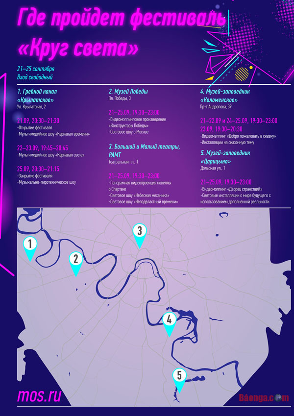 Lễ hội "Vòng tròn ánh sáng" năm nay sẽ có sự góp mặt và trình diễn của các nhóm đến từ 36 quốc gia trên thế giới, được tổ chức tại 7 địa điểm nổi tiếng Moskva: Quảng trường Nhà hát lớn, Kênh chèo thuyền ở Krylatskoe, đồi Poklonnaya, công viên Kolomenskoye, công viên Tsaritsyno, trung tâm Kỹ thuật Tháng Mười và phòng hòa nhạc Mir.