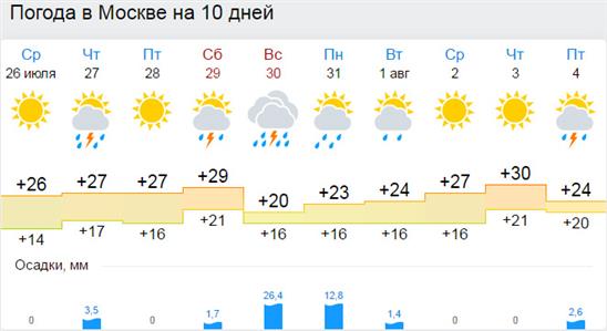 Tuy nhiên, tiết trời nắng nóng, oi bức sẽ không duy trì lâu ở Moskva, đến chủ nhật 30/7, ở Moskva sẽ có thể có mưa lớn (30-35 mm), có thể đạt 1/3 định mức lượng mưa hàng tháng, với nhiều sấm sét và gió mạnh.