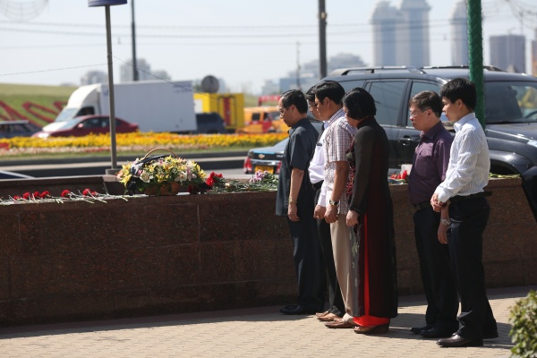Đoàn đại biểu của Đại sứ quán Việt Nam tại LB Nga đặt hoa tưởng niệm trước nhà ga "Công viên Chiến thắng" ( Nguồn: rg.ru)