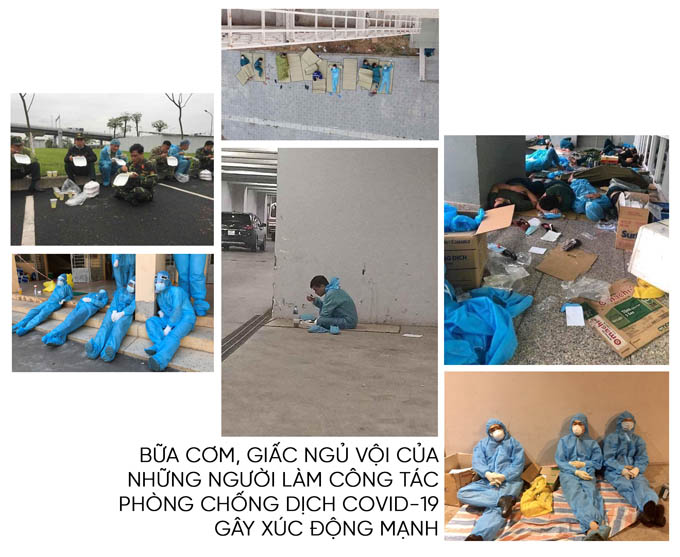 Miếng cơm ăn vội ở góc đường, chân cầu thang hay những đêm sương lạnh, đội ngũ y bác sỹ, chiến sỹ... rải bìa cát tông ra ngoài trời tranh thủ chợp mắt để nhường chỗ cho người về cách ly.