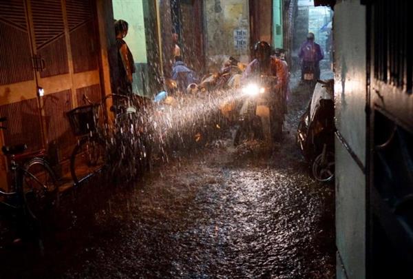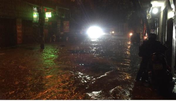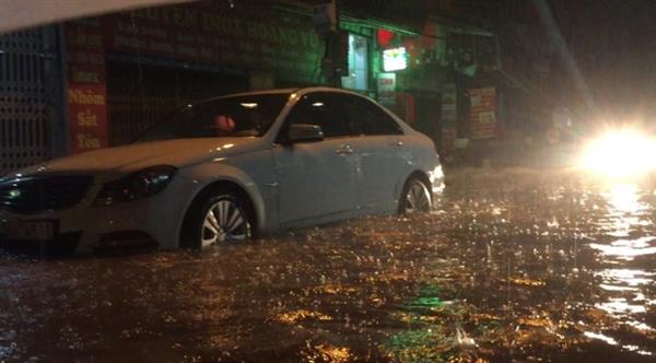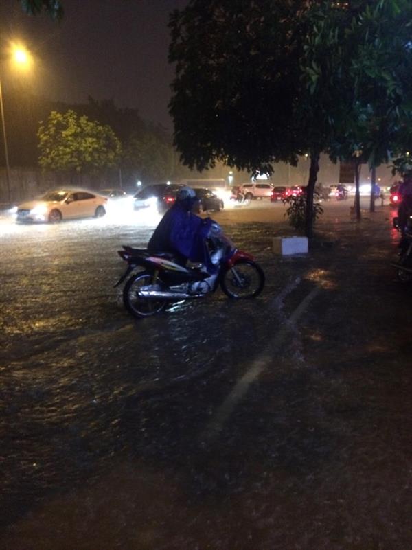 Ghi nhận tại khu vực phường Xuân Đỉnh (quận Bắc Từ Liêm, Hà Nội), mưa bắt đầu khoảng 20 giờ ngày 12.5 và kéo dài liên tục trong gần 1 giờ. Tuyến đường Xuân Đỉnh bị ngập sâu, các phương tiện giao thông rất khó khăn di chuyển qua lại.