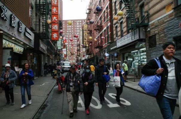 Khách du lịch và người dân đi bộ trên phố Pell, khu phố Tàu Manhattan, New York, Mỹ,