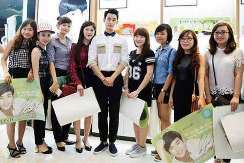 Kim Soo Hyun chụp ảnh và ký tặng khoảng 100 fan trong lần đầu đến Việt Nam. Để có cơ hội đứng cùng anh, fan phải mua sản phẩm nhà tài trợ để đổi vé.