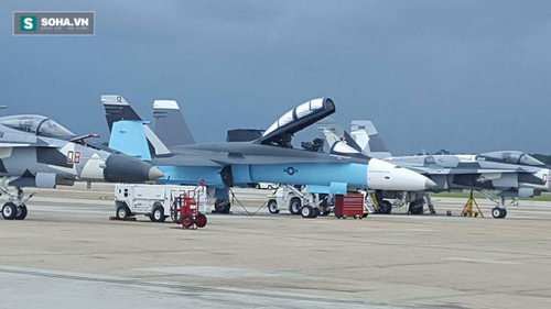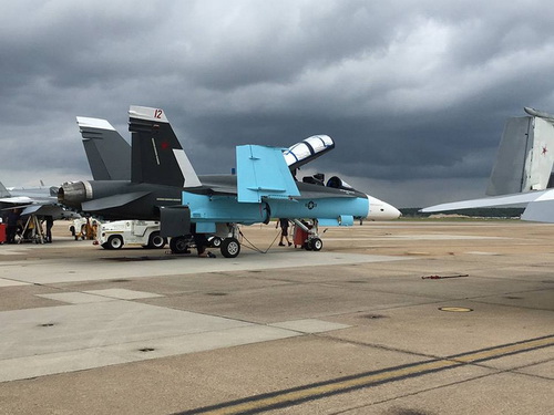 Trong số 3 chiếc F/A-18 ở trong ảnh (thuộc biên chế phi đoàn VFC-12, Hải quân Mỹ), chiếc F/A-18B 2 chỗ ngồi ở giữa được sơn màu đen nhám giống tiêm kích Su-30SM và Su-34 của Nga.