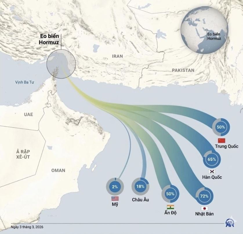 Tỷ lệ phụ thuộc vào Eo biển Hormuz đối với nhập khẩu năng lượng.
