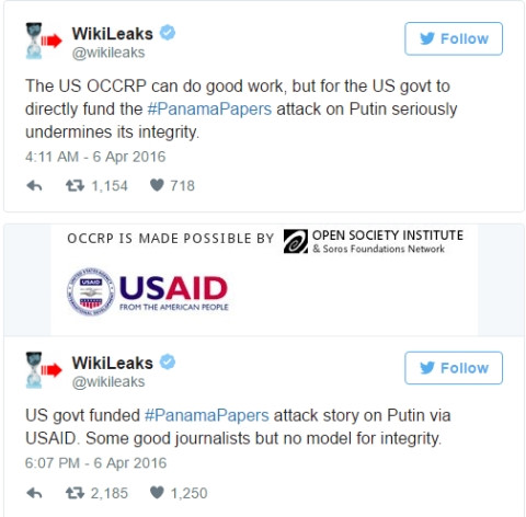 Theo RT, WikiLeaks- tổ chức chuyên hé lộ những thông tin động trời mà Chính phủ các nước ra sức che giấu- ngày 6/4 chia sẻ trên tài khoản Twitter của mình rằng, vụ rò rỉ Hồ sơ Panama là sản phẩm của Dự án Tố cáo tội phạm và Tham nhũng có Tổ chức (OCCRP) “nhằm vào Nga và Liên Xô cũ”.
