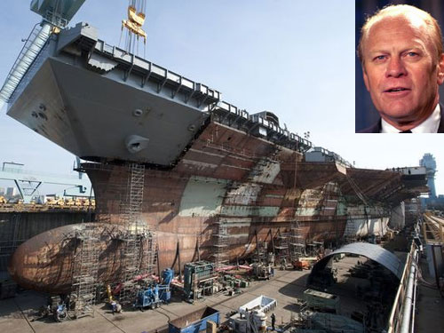 Tàu được đặt theo tên cố Tổng thống Mỹ Gerald R. Ford (ảnh nhỏ). Ảnh: Detroit Free Press