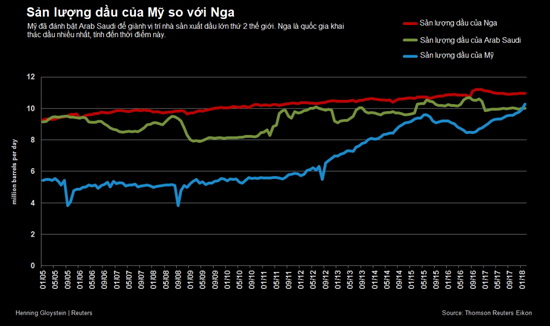 Hồi đầu tháng 2, Cơ quan Thông tin Năng lượng Mỹ (EIA) cho biết sản lượng dầu của Mỹ sẽ vượt qua ngưỡng 11 triệu thùng/ngày vào cuối năm 2018. Con số này sẽ giúp Mỹ đánh bại quốc gia sản xuất dầu hàng đầu là Nga, với sản lượng khai thác chỉ thấp hơn mức này một chút.