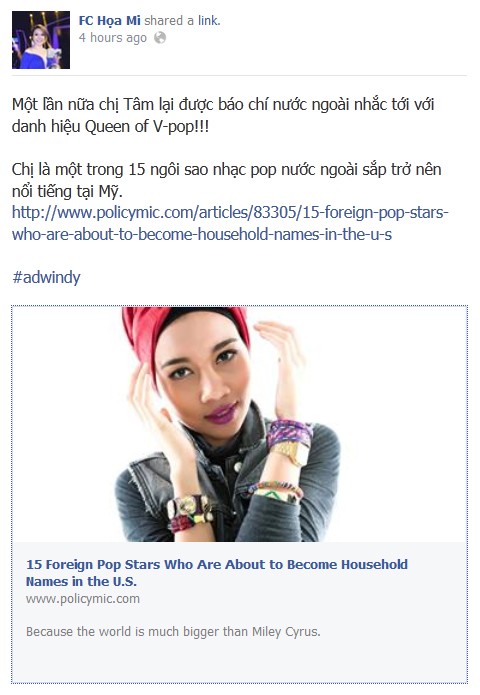 Mới đây, một trang web của Mỹ với địa chỉ PolicyMic.com đăng bài viết "15 ngôi sao nhạc pop quốc tế sẽ nổi tiếng ở Mỹ", trong đó, có nhắc tới tên Mỹ Tâm của Việt Nam. Ngoài ra, danh sách còn có Lý Vũ Xuân (Trung Quốc), AKB48 (Nhật Bản), Yuna (Malaysia) và nghệ sĩ của một số quốc gia như Afghanistan, Rwanda, Sri Lanka, Ai Cập...