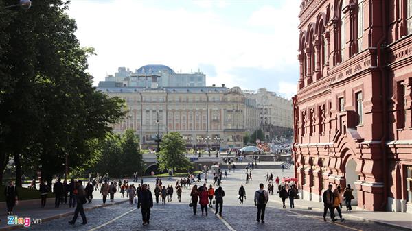 Lần đầu tiên tới Nga, lại đúng dịp sắp diễn ra World Cup, lối kiến trúc của bất cứ toà nhà nào nơi đây cũng khiến tôi choáng ngợp. Quảng trường Manezhnaya là khu vực dành cho du khách tản bộ tham quan. Đây cũng là nơi kết nối Quảng trường Đỏ và con đường Tverskaya sầm uất. Ngoài các công trình kiến trúc, nơi đây còn có những dãy phố phục vụ nhu cầu ẩm thực cho du khách.