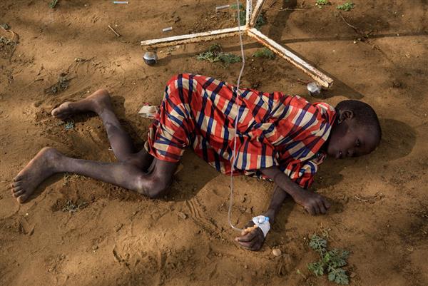 Naneyan Lokopir, 13 tuổi, nằm co ro trên nền đất. Lokopir bị sốt rét và đất là giường bệnh của cậu ở Nam Sudan - Ảnh: Phil Hatcher-Moore