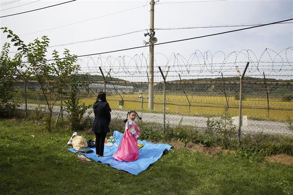 Ở nơi khác, bên kia biên giới là Hàn Quốc, không chân lấm tay bùn, em bé này đang cùng mẹ làm một nghi lễ hướng về tổ tiên ở miền bắc Triều Tiên - Ảnh: EPA