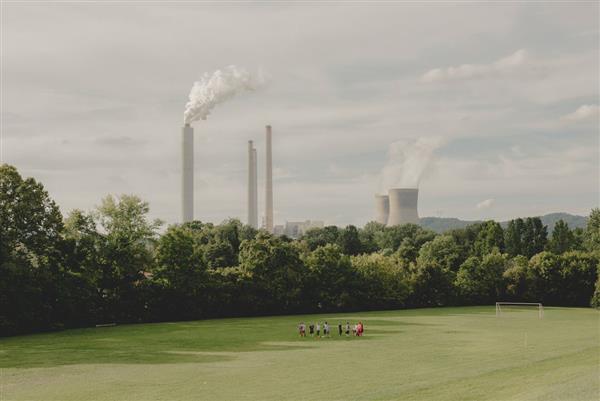 Trẻ em chơi bóng đá tại Poca, bang West Virginia, trên nền các cột khói thải ra từ những nhà máy than gần đó. Nước Mỹ đã rút khỏi Thỏa thuận Paris về chống biến đổi khí hậu với lập luận nó không công bằng cho người Mỹ - Ảnh: NEW YORK TIMES