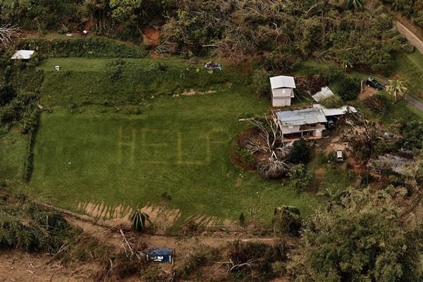 2017 là năm của những trận siêu bão. Khi đức tin không thể cứu rỗi những thân xác đang thiếu thức ăn và nước uống, người ta chọn cách cầu cứu đồng loại. "Giúp đỡ" - những chữ được tạo ra bằng máy cắt cỏ này trở thành cơ hội sống cuối cùng của một gia đình bị cô lập sau bão ở vùng lãnh thổ Puerto Rico của Mỹ hồi tháng 10 - Ảnh: TIME