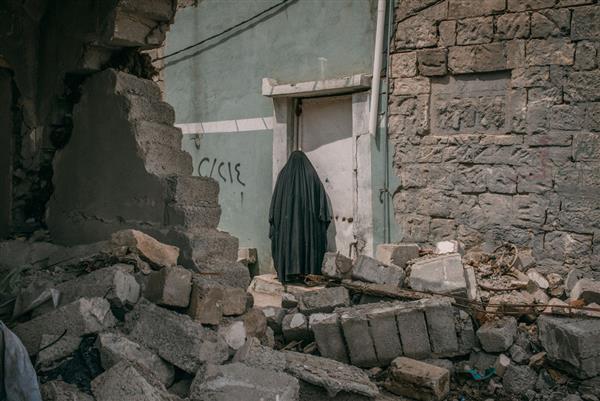 Ngụy trang? Không, đó là một người phụ nữ trong áo "burqa" - trang phục dành cho phụ nữ Hồi giáo, đang đứng giữa đống đổ nát ở thành phố Mosul, Iraq ngày 3-4 - Ảnh: TIME