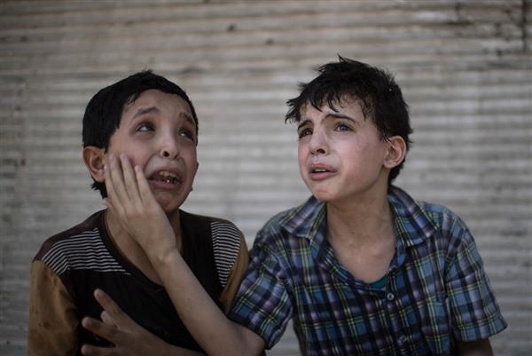 Zeid Ali, 12 tuổi (bên trái) và Hodayfa Ali, 11 tuổi, đang tự an ủi lẫn nhau sau khi nhà của hai em trúng bom và đổ sập trong một cuộc giao tranh giữa quân đội Iraq và IS tại Mosul ngày 24-6. Nói trong nước mắt, cả hai tin rằng cha mẹ của mình vẫn còn bên dưới đống đổ nát - Ảnh: AP