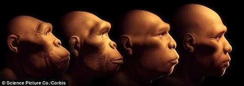 Loài người đã tiến hóa qua các giai đoạn sau (từ trái qua phải): Australopithecus afarensis (họ người hominid đầu tiên), Homo habilis, Homo erectus, Homo sapiens (người thông minh) - Ảnh: Corbis