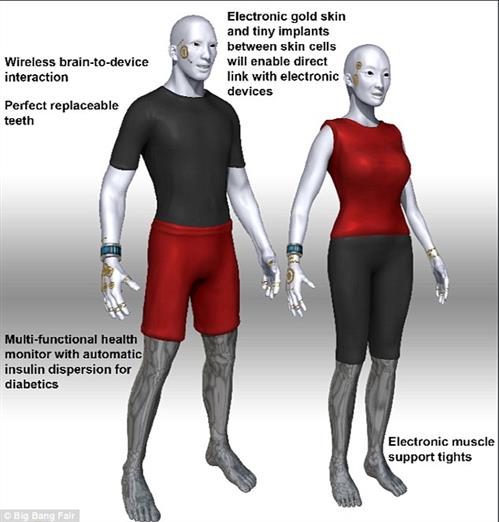 Điều này có thể làm phát sinh một số điều kỳ lạ nhưng tuyệt vời. Đó là chúng ta được kết nối trực tiếp với công nghệ thông qua “da điện tử” (electronic skin) hay cấy ghép nhỏ giữa tế bào. Quần điện tử hỗ trợ (support tights) sẽ tăng cường sức mạnh của chân và cơ bắp. Dạng make up mới cho phép tạo lớp màng trên da có thể thay đổi diện mạo một cách hoàn hảo. Công nghệ nano giúp chúng ta tự chữa từ bên trong, như tự thay thế rằng chẳng hạn.