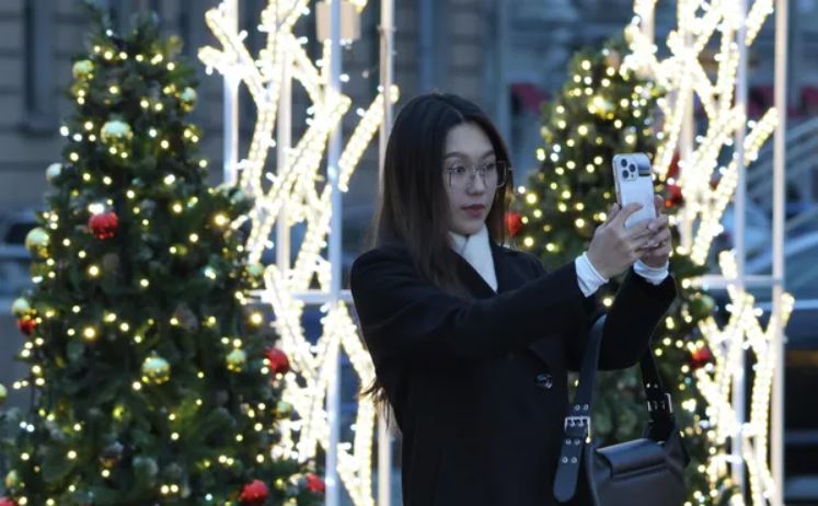 Cô gái chụp ảnh trên đường phố với phông nền là đồ trang trí mừng Năm Mới ở