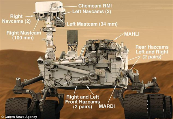 Hình mô phỏng vị trí các camera của tàu Curiosity. Hiện tại, các tài xế của tàu thám hiểm tự hành này bắt đầu một ngày làm việc của họ bằng cách nghiên cứu các hình ảnh về cảnh quan sao Hỏa được tàu truyền về Trái đất trong ngày trước đó. (Ảnh: Caters News Agency)
