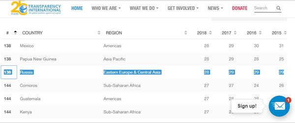 Theo đánh giá Chỉ số Nhận thức tham nhũng (CPI) của Tổ chức Minh bạch Quốc tế, năm 2018, Nga chỉ đạt 28 điểm (thang điểm 100), đứng thứ 138/180 quốc gia, nằm trong danh sách những quốc gia có tham nhũng cao.