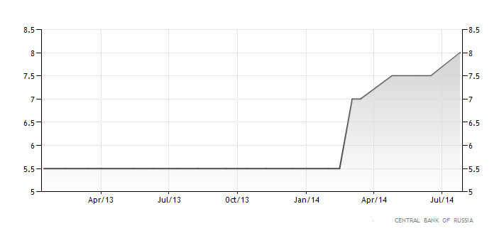 Hôm nay 25/7, Ngân hàng trung ương Nga vừa bất ngờ nâng lãi suất cơ bản từ 7,5% lên 8% do tác động của căng thẳng địa chính trị lên rủi ro lạm phát. Đây là lần nâng lãi suất thứ 3 liên tiếp kể từ đầu năm 2014 đến nay. Đồng thời, mức lãi suất mới (8%) cao hơn nhiều so với lãi suất trung bình trong hơn 10 năm qua của Nga (6,49%).