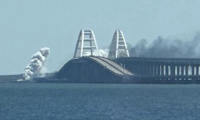 Cầu Crimea bao phủ bởi khói trắng sau một vụ tấn công vào đầu giờ chiều ngày 12/8.