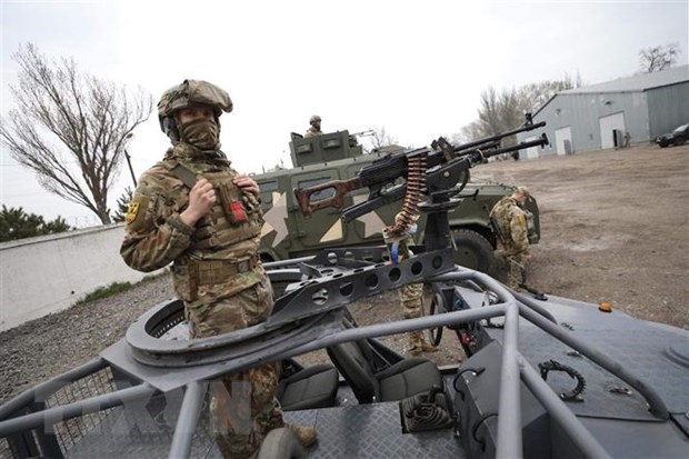 Lực lượng phòng vệ quốc gia Ukraine tham gia cuộc tập trận gần cảng biển Azov, ngày 19/4/2021. (Ảnh: AFP/TTXVN)