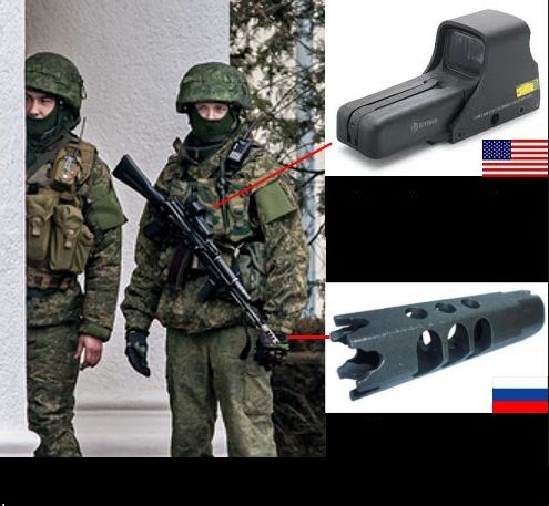 Một lính Nga được trang bị kính ngắm giao thoa laser của hãng EOTech, Mỹ, hoặc một phiên bản copy, cùng bộ hãm giật RTK-3 của Nga