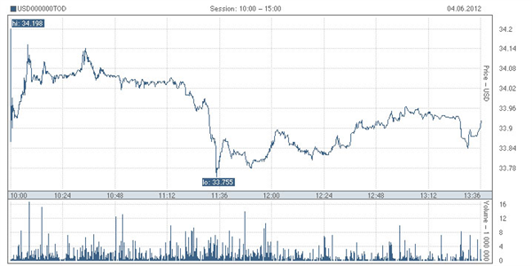 Biểu đồ tỷ giá USD/RUR 04.06.2012 tại sàn giao dịch ngọai tệ ММВБ – РТС: