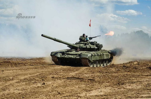 Xe tăng T-72B thao diễn với màn bắn đại liên 12,7mm tại khu vực diễn ra sự kiện giới thiệu P90 tới thị trường Nga.