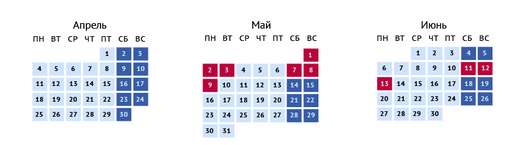Đầu tháng 5 người dân Nga sẽ được nghỉ 4 ngày liên tiếp - từ ngày 30/04 đến hết ngày 03/05/2016 nhân dịp Ngày Quốc tế lao động 1 tháng 5, cơ quan quản lý lao động LB Nga Rostrud lưu ý.