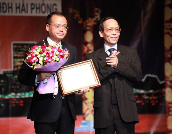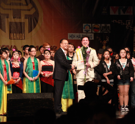 Ông Đỗ Xuân Hoàng - Chủ tịch Hội người Việt Nam tại LB Nga lên trao giải nhì đơn ca nam cho ca sĩ Trung Dũng - Hội ĐH Hải Phòng