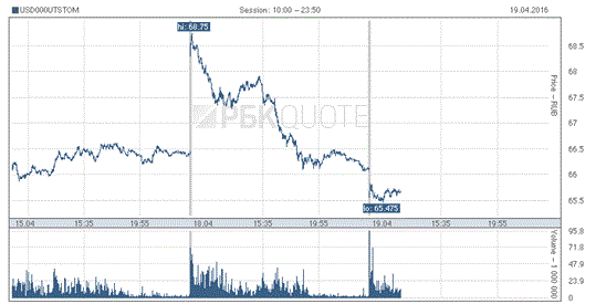 Biểu đồ tỷ giá USD trên sàn ngoại hối Moskva trong 3 ngày 15, 18 và 19/4/2016