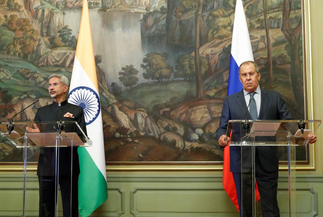 Bộ trưởng Ngoại giao Nga Sergei Lavrov (phải) và Bộ trưởng Bộ Ngoại giao Ấn Độ Subrahmanyam Jaishankar tại một cuộc họp báo chung. Ảnh: Reuters