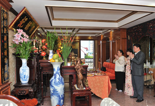Vợ chồng Trang Nhung cùng mẹ cúng gia tiên trong ngày tân gia.