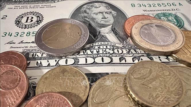 Đồng euro (trái) và đồng đô la Mỹ (phải) tại Madrid, Tây Ban Nha, ngày 11/7. Ảnh: THX/TTXVN