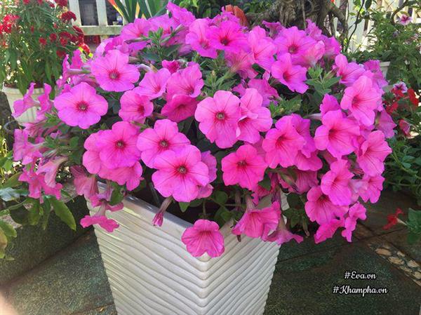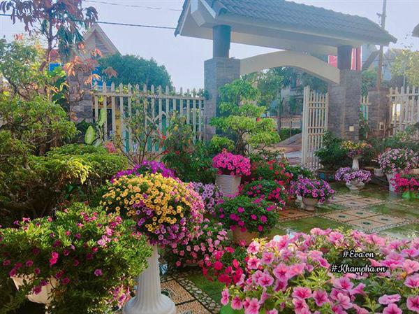 Từ cổng vào đến giữa sân, chỗ nào cũng có những chậu hoa dạ yến thảo rực rỡ.