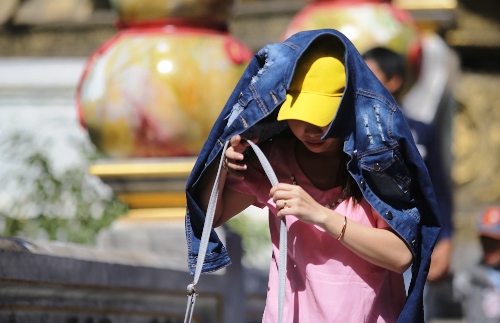 Dưới cái nắng quá gắt, một người phụ nữ phải lấy áo khoác che lên đầu.