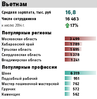 Theo thống kê số hạn ngạch được cấp trong năm 2014, ba nước cung cấp nhiều lao động nhất vào Nga là: Trung Quốc: 80 662 lao động, Thổ Nhĩ Kỳ: 54 730 lao động và Bắc Triều Tiên: 47364 người, chỉ riêng 3 quốc gia này đã cung cấp đến 80% tổng số lao động nhập cư vào Nga. Việt Nam đứng thứ 4 với 16 463 lao động. So với các nước châu Âu, Serbia là nước có số lượng lao động vào Nga nhiều nhất với 10106 lao động, trong lúc tổng số lao động từ Liên minh châu Âu chỉ có 10.628 chỉ tiêu.